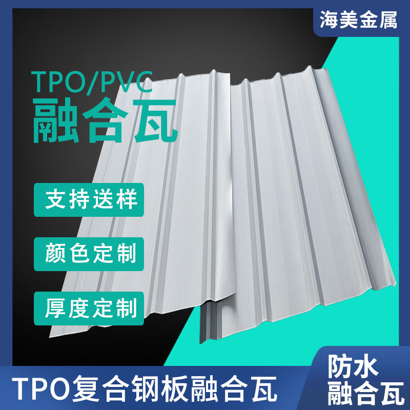 海美防水瓦以鋼板為基板,表面貼覆具有防水防腐功能的TPO/PVC卷材(熱塑性聚烯烴類防水卷材),是海美金屬推出的新一代防水防腐屋面建筑材料。海美防水瓦主要特點就是在各類環境下不易生銹不易漏水,使用熱風焊接進行相連,覆蓋全部裸露的縫隙,在使用過程中可以達到蓄水不滲透的效果,防水效果好,同時還有較好的抗風揭性能和耐老化性能,為鋼結構建筑屋面提供了長久的防護。